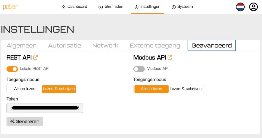 - API-toegang: Hier genereer of vind je de tokens (zoals de Bearer token die je in Node-RED gebruikt) om de lader te koppelen aan je eigen systemen.