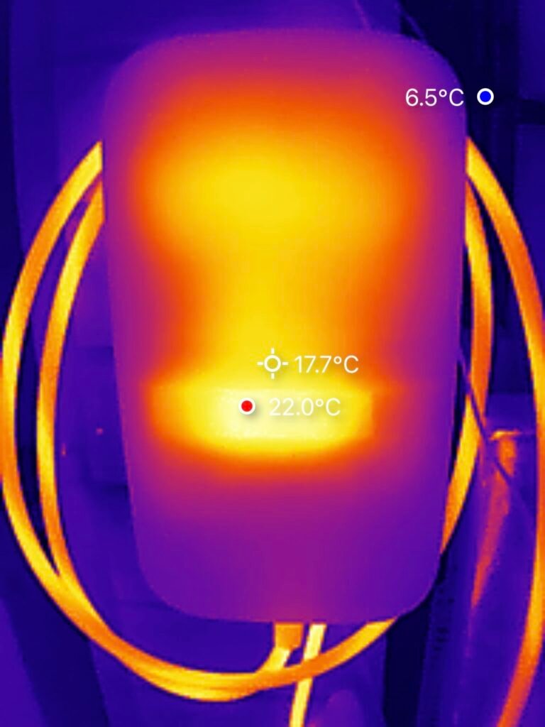 Deze warmtebeelden zijn gemaakt na een laadsessie van meerdere uren op een constante stroomsterkte van 20A. De metingen laten zien dat de Peblar de warmte uitstekend beheerst: aan de buitenzijde bedraagt de piektemperatuur slechts 22°C. Hoewel de omgevingstemperatuur in de garage op dat moment 13°C was, is een stijging van slechts 9 graden boven de omgevingstemperatuur erg netjes. Ook de bekabeling blijft opvallend koel, wat duidt op een efficiënte interne opbouw en goede kabelverbindingen. Dat mag ook wel als je met 1-fase tot 7,4 kW kunt gaan en met 3-fasen tot 22 kW