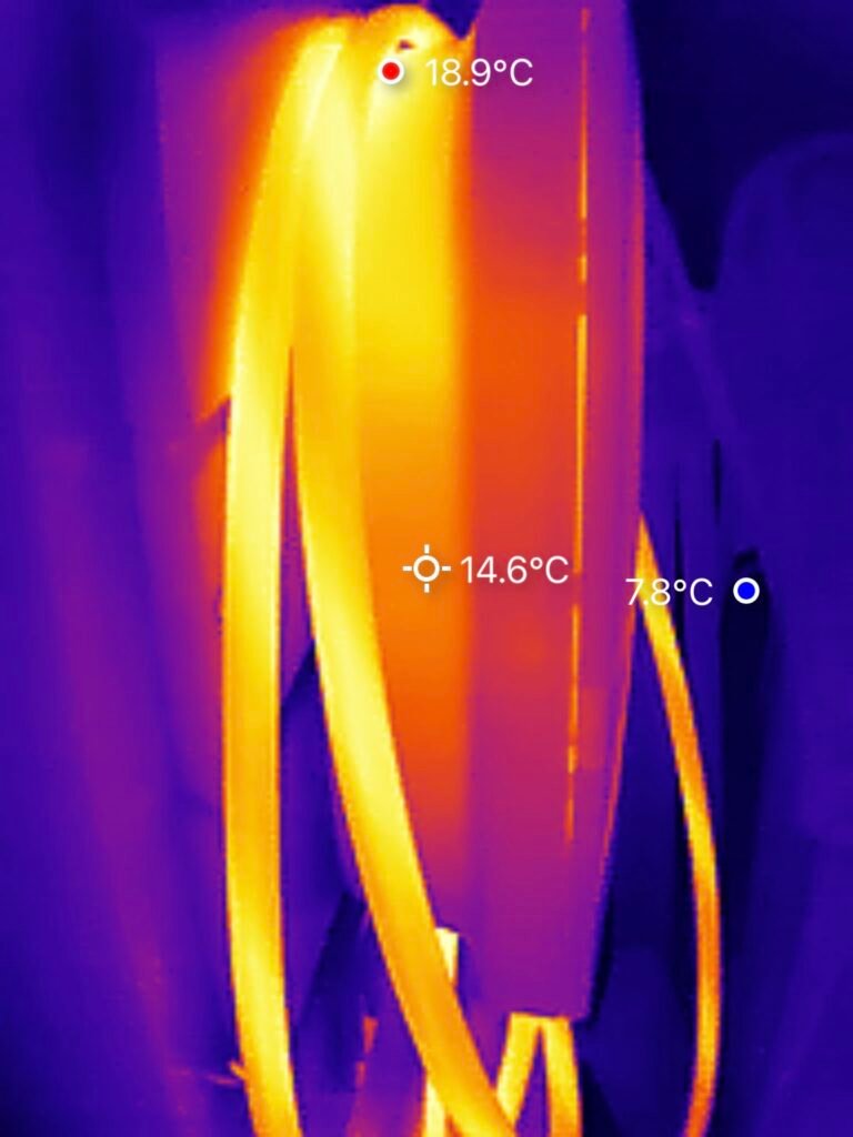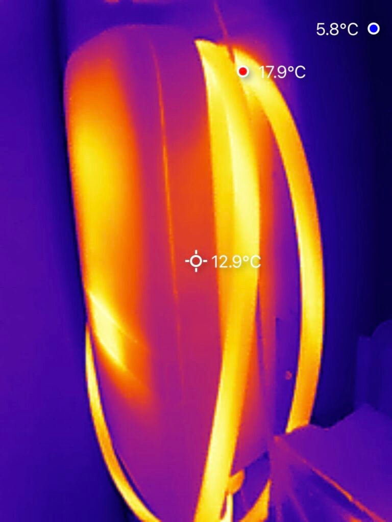 Omdat ik op 1-fase laad (mijn auto heeft een 1-fase boordlader) met een hogere stroomsterkte (20A), is hittebeheer belangrijk(de Peblar Business kan zelfs tot 32A op 1-fase). Zoals je aan de warmtebeelden verderop kunt zien blijft de Peblar netjes koel tijdens sessies van meerdere uren. In combinatie met de Dynamic Load Balancing reageert de lader zeer vlot op andere grote verbruikers in huis, waardoor de hoofdzekering nooit gevaar loopt.