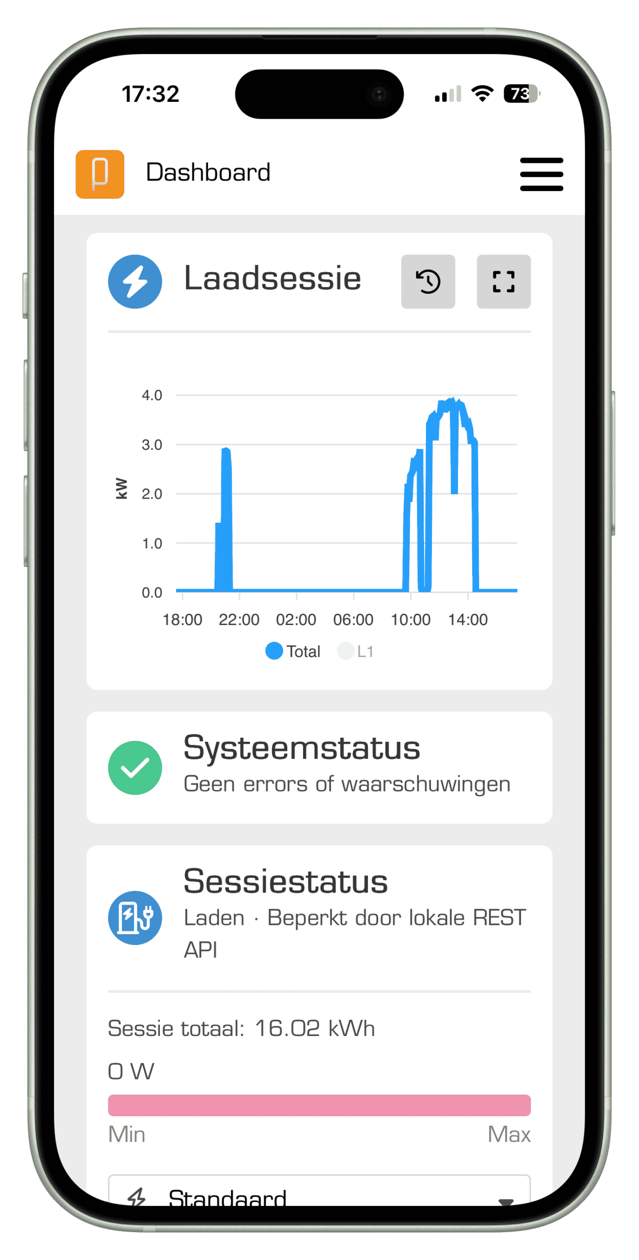- statusinformatie Daarnaast kun je via de lokale API automatiseringen bouwen, zoals laden op goedkope uren of alleen op zonne‑energie.