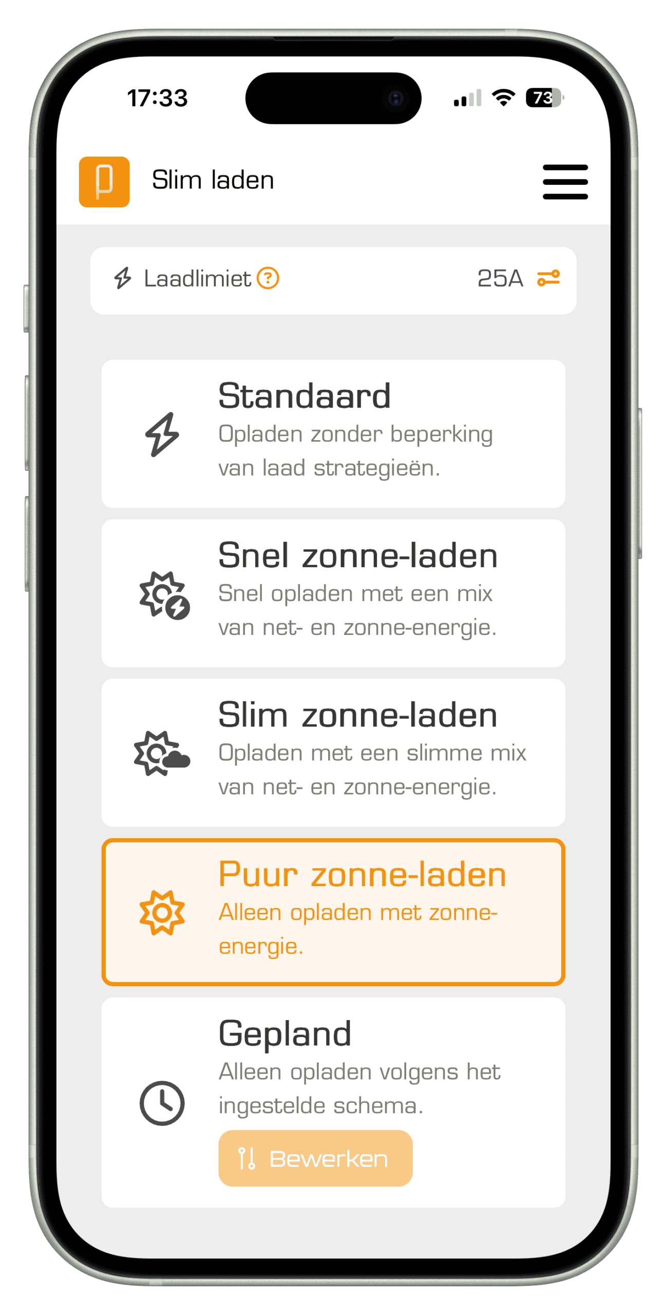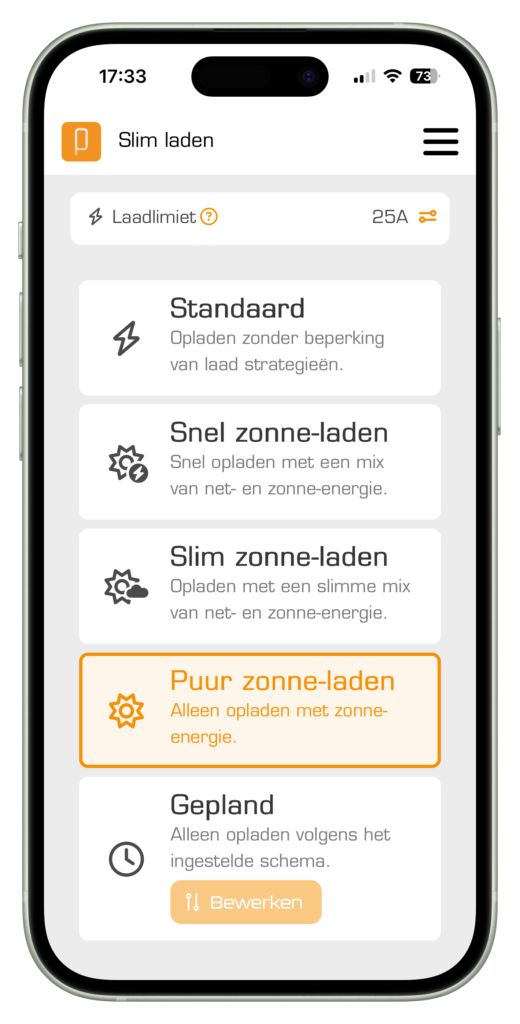 - Puur zonne-laden: Alleen laden als er daadwerkelijk overproductie is