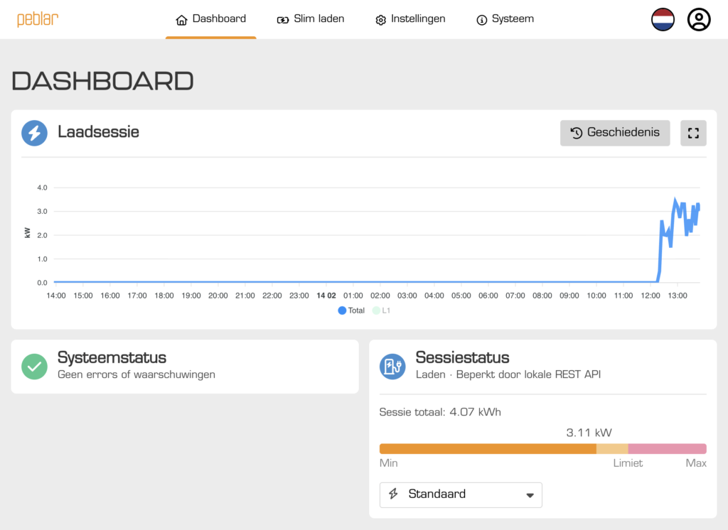 - De brug: De Peblar-lader “praat” via je lokale netwerk direct met de Homewizard P1-meter. Er is geen tussenkomst van een externe cloud nodig voor de basisfunctionaliteit.