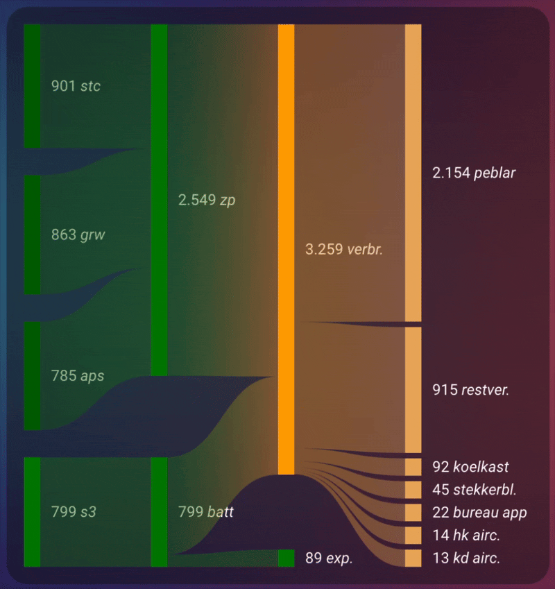 In combinatie met een Node-RED script binnen Home Assistant resulteert dit in een naadloze ‘groene’ laadsessie. Zoals de Sankey grafiek hieronder laat zien, benut de Peblar de beschikbare zonne-energie volledig. Soms zie je nog een kleine hoeveelheid export naar het net of een korte importpiek. Dit is een bewuste keuze: in het Node-RED script is een ‘drempelwaarde’ ingebouwd. De laadstroom wordt pas aangepast bij een significante wijziging in de overproductie. Hiermee voorkom ik dat de lader constant op en neer schakelt bij hele kleine wijzigingen.