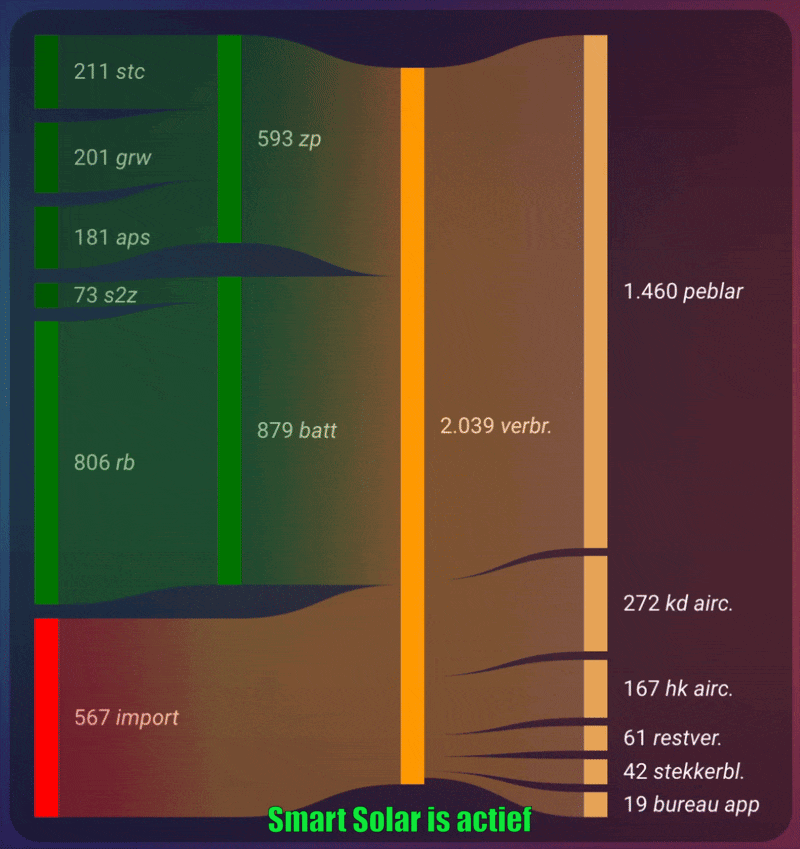 Daarnaast biedt de Peblar Business de mogelijkheid om volledig op de overproductie van je zonnepanelen te laden (Pure Solar). Om het verschil tussen de modi Pure en Smart te verduidelijken zie je hieronder via een Sankey-diagram uit Home Assistant het moment waarop de lader overschakelt van Smart Solar naar Pure Solar. Hoewel ik een visualisatie binnen Home Assistant gebruik, is het belangrijk om te weten dat het volledige proces zich direct op de Peblar zelf afspeelt onafhankelijk van Home Assistant.