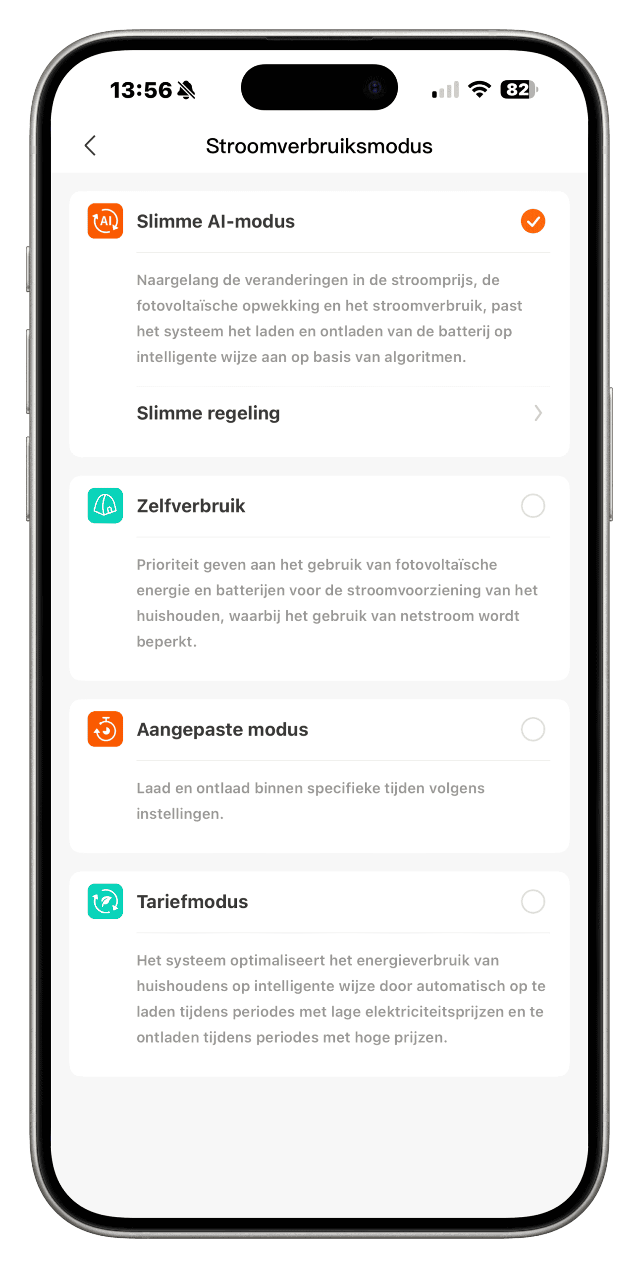 - ▸ App modi: Zelfverbruik modus en slimme AI-modus — goede set-and-forget modi