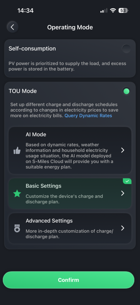 Der Time-of-Use-Modus des HiBattery 1920 AC (d. h. dynamische Tarife) ist eine intelligente Verwaltungsfunktion, die entwickelt wurde, um Ihre Energiekosten auf der Grundlage dynamischer Energiepreise zu minimieren. Anstatt die Batterie einfach aufzuladen, wenn die Sonne scheint, können Sie mit diesem Modus genau festlegen, wann die Batterie geladen oder entladen wird, entweder automatisch oder mithilfe von „KI”.