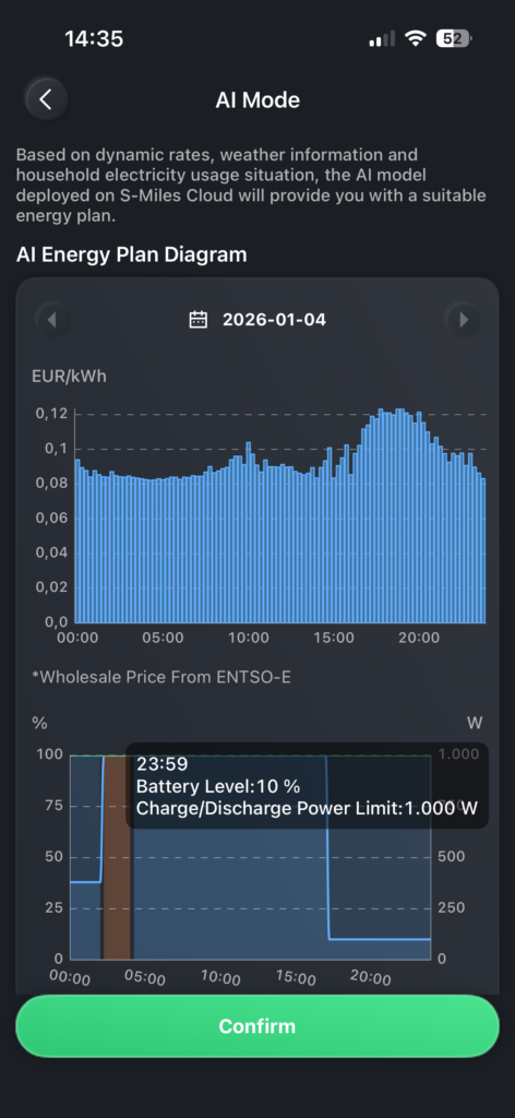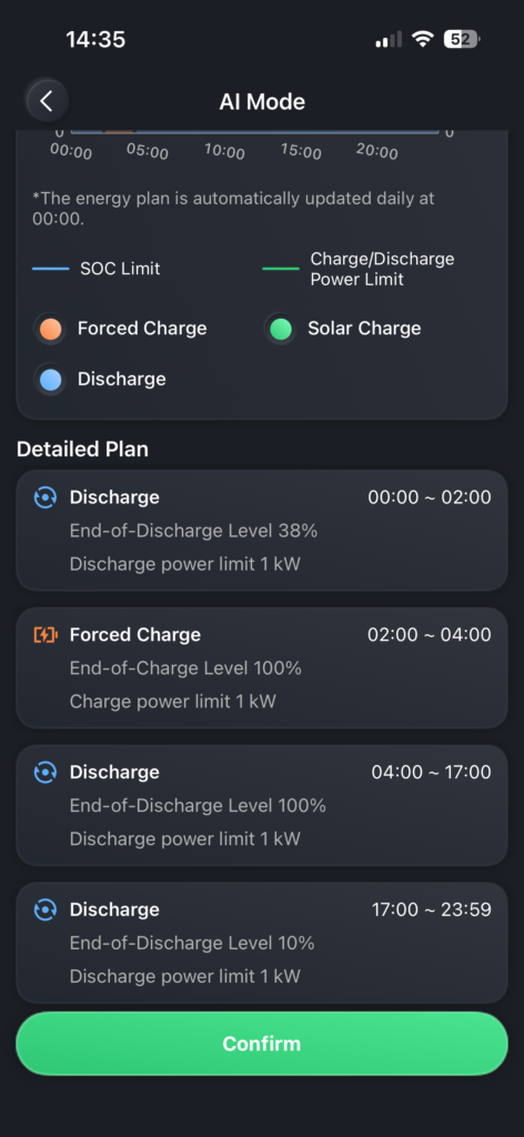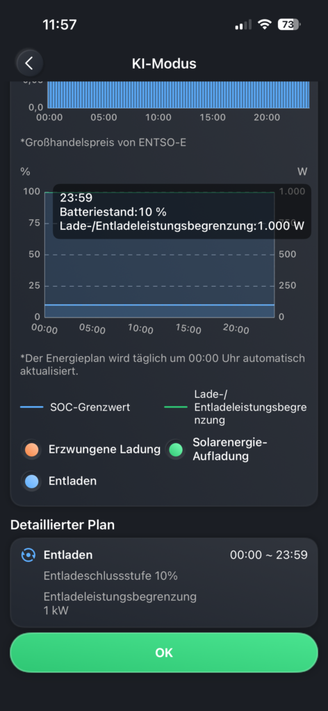 Im Gegensatz zu vielen anderen Stromspeicher bietet der HiBattery 1920 AC vollständige Transparenz. Das „KI-System” präsentiert einen detaillierten Tagesplan, der genau anzeigt, welche Aktionen wann ausgeführt werden. Dieser Plan wird kontinuierlich auf der Grundlage der Wettervorhersage, Ihres täglichen Verbrauchsprofils und der aktuellen dynamischen Energiepreise optimiert.