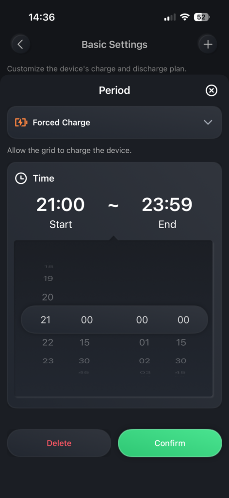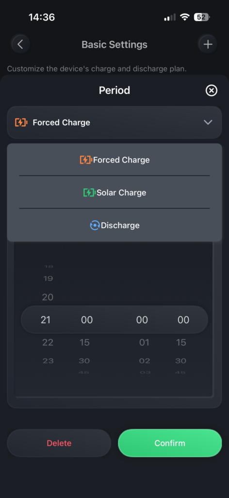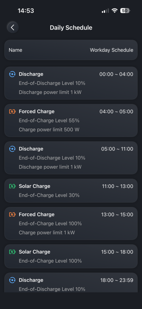 Im TOU-Modus übernehmen Sie selbst die Kontrolle über die Lade- und Entladezyklen über die App. Sie können bestimmte Zeitfenster für verschiedene Aktionen festlegen: