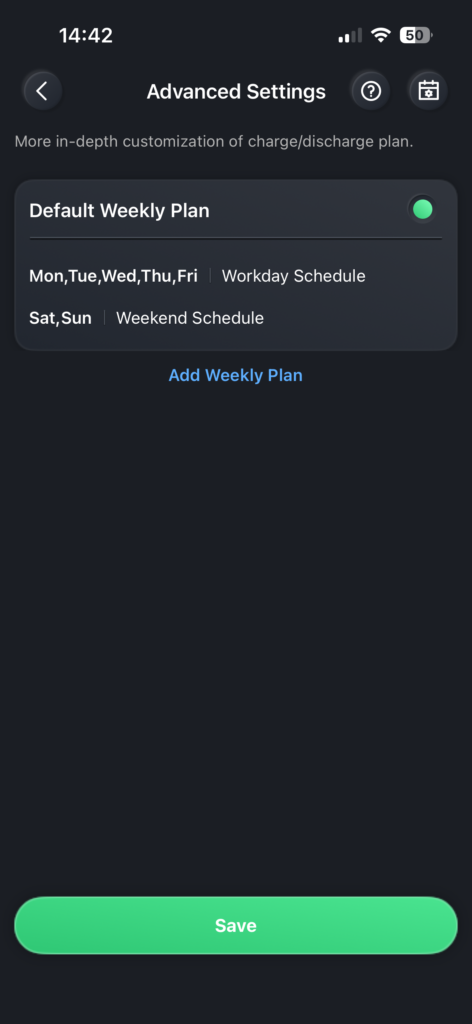 Die erweiterten Einstellungen im TOU-Modus bieten zusätzliche Möglichkeiten für das Energiemanagement durch personalisierte Wochenpläne, in denen Sie für jeden Tag bestimmte Zeitfenster für das Laden und Entladen festlegen können. Sie können dabei die Funktion „Forced Charge” aktivieren, um die Batterie gezielt während günstiger Stunden oder aus einem besonderen Grund aus dem Netz aufzuladen, während Sie mit den Funktionen „Power Limit” und „SoC-Limits” genau festlegen, mit welcher Leistung die Batterie arbeitet und welcher Prozentsatz als Reserve erhalten bleiben soll. Ebenso können Sie mit der Entladefunktion das Entladen in teureren Zeiträumen und mit der Solar–Ladefunktion das Laden nur mit PV-Überschuss steuern. Dabei können Sie jeweils die Leistung und den SoC einstellen.