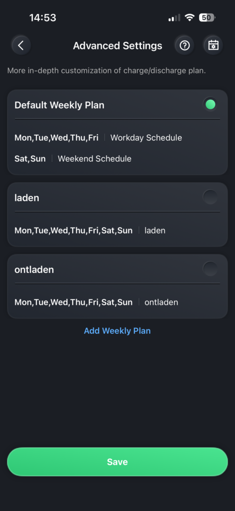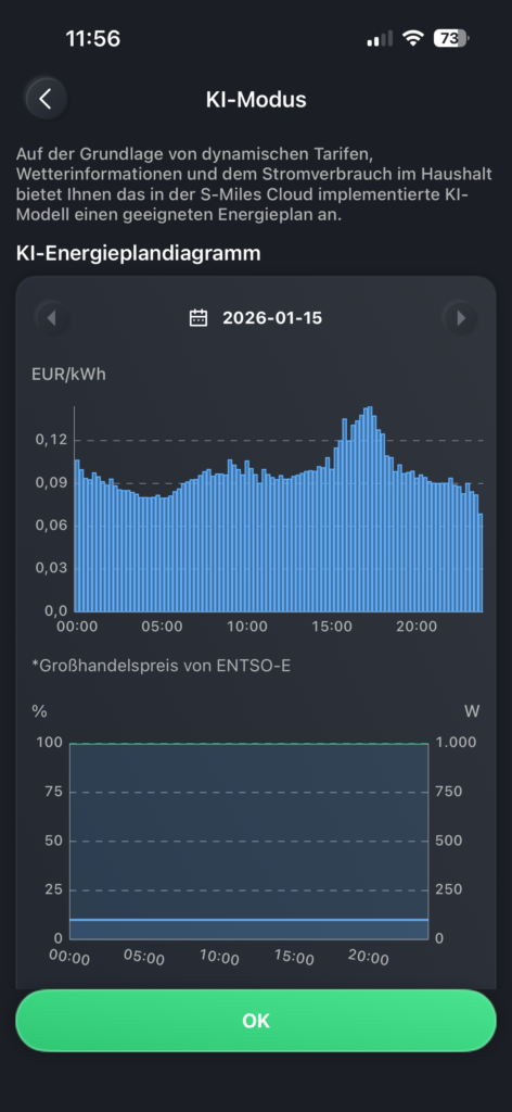 - (Abhängig von der Region und Aktualisierungen) Berücksichtigen Sie Wettervorhersagen und Preisschwankungen, um automatisch die günstigsten Zeitpunkte für das Laden und Entladen auszuwählen.
