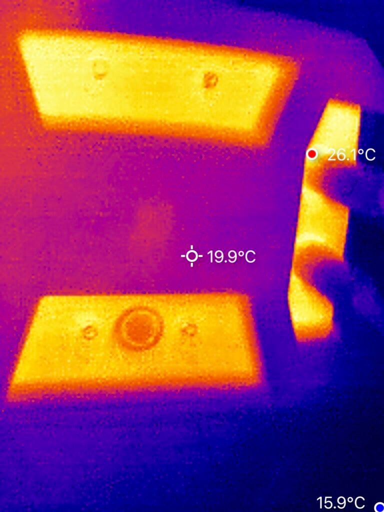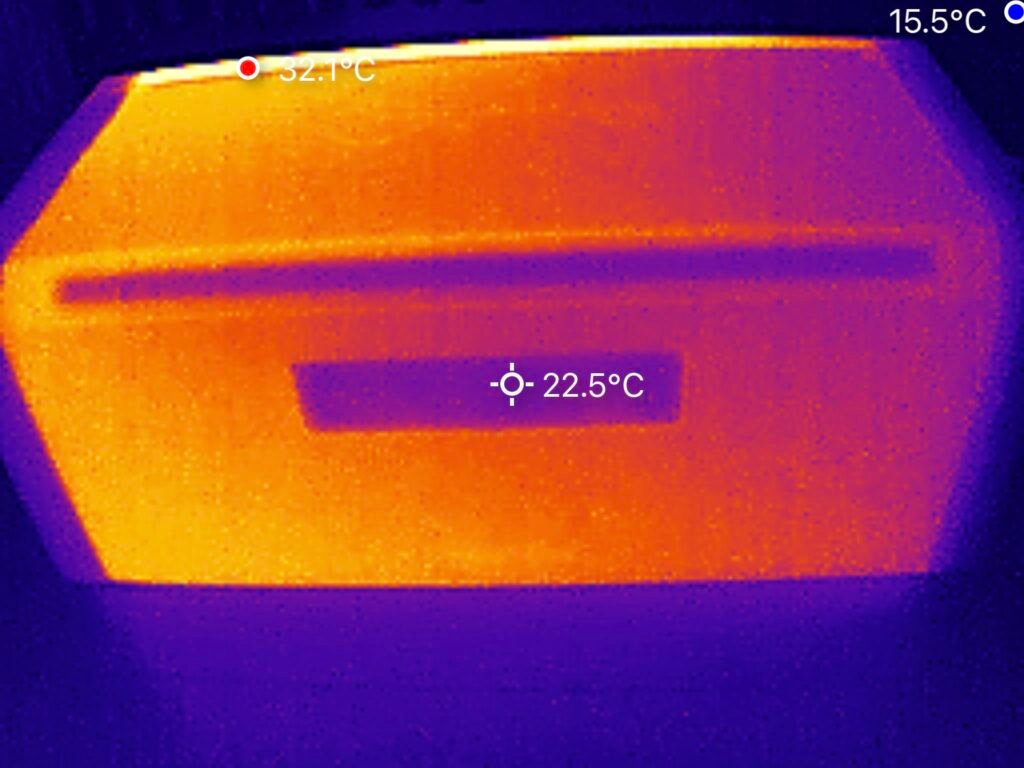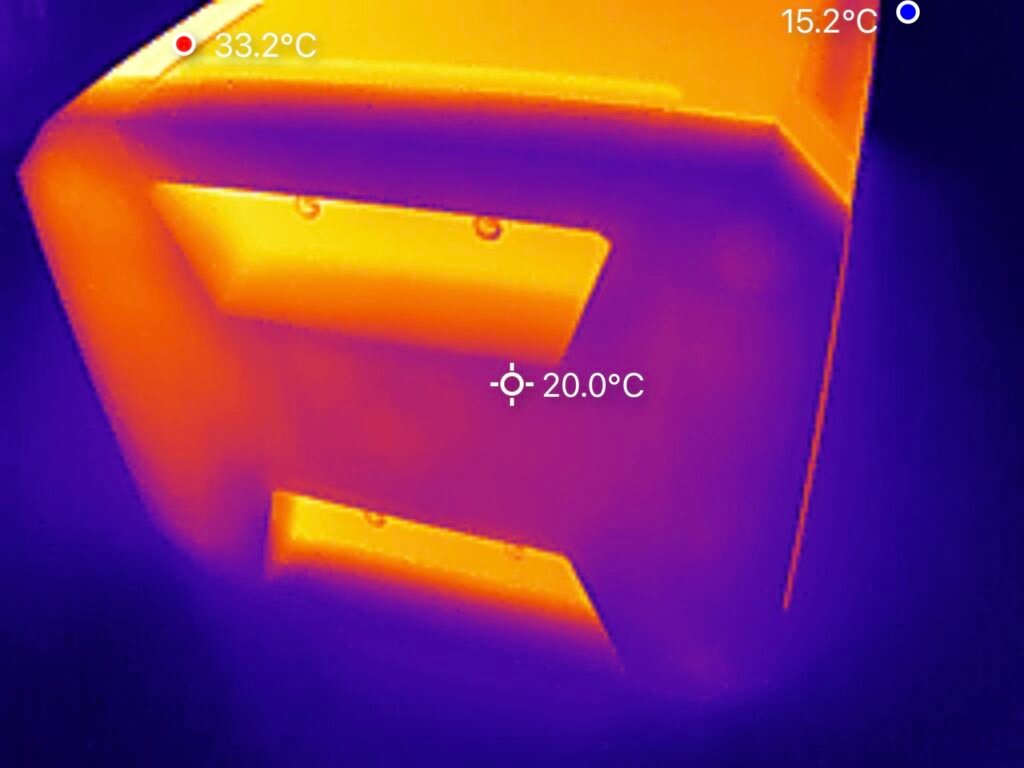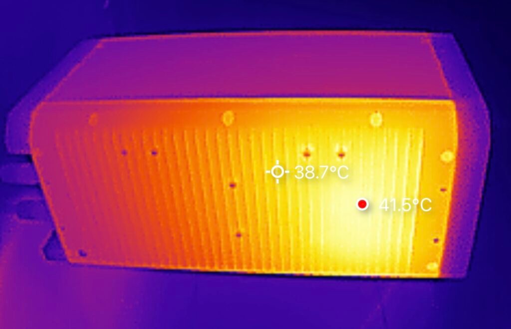 Diese Wärmebilder wurden aufgenommen, während die HiBattery 1920 AC mehrere Stunden lang kontinuierlich mit 800 W geladen wurde. Die Temperaturmessungen zeigen, dass die passive Kühlung effektiv funktioniert: Die höchste gemessene Temperatur beträgt 41,5 °C. Dieses Ergebnis unter Dauerbelastung ist hervorragend und deutet auf eine sehr effiziente Wärmeableitung hin. Die Umgebungstemperatur betrug etwa 16 °C.