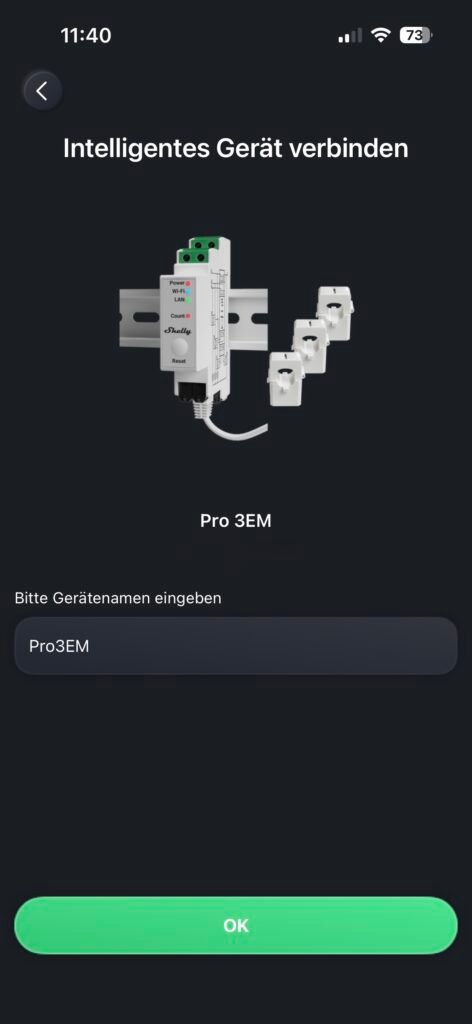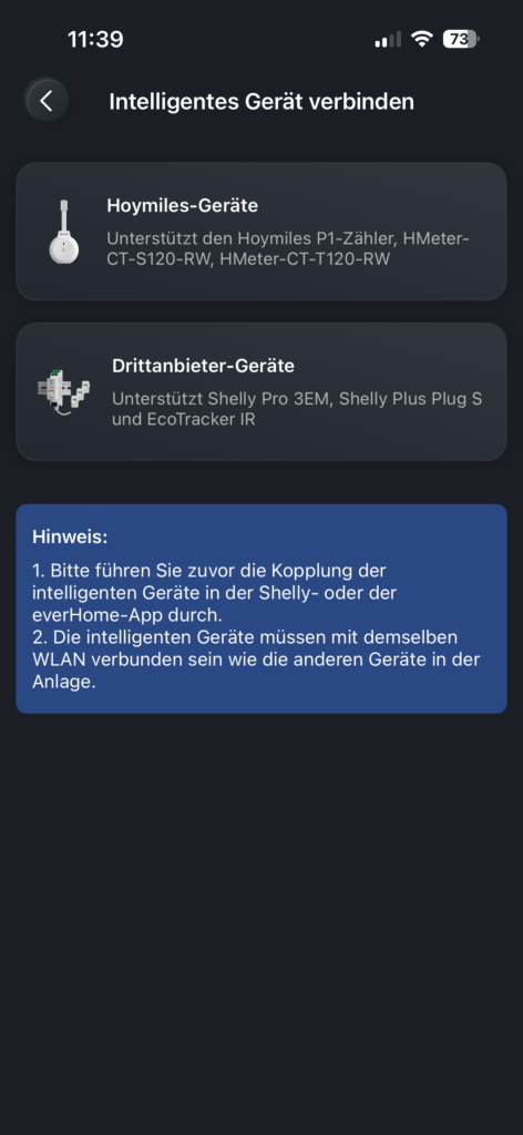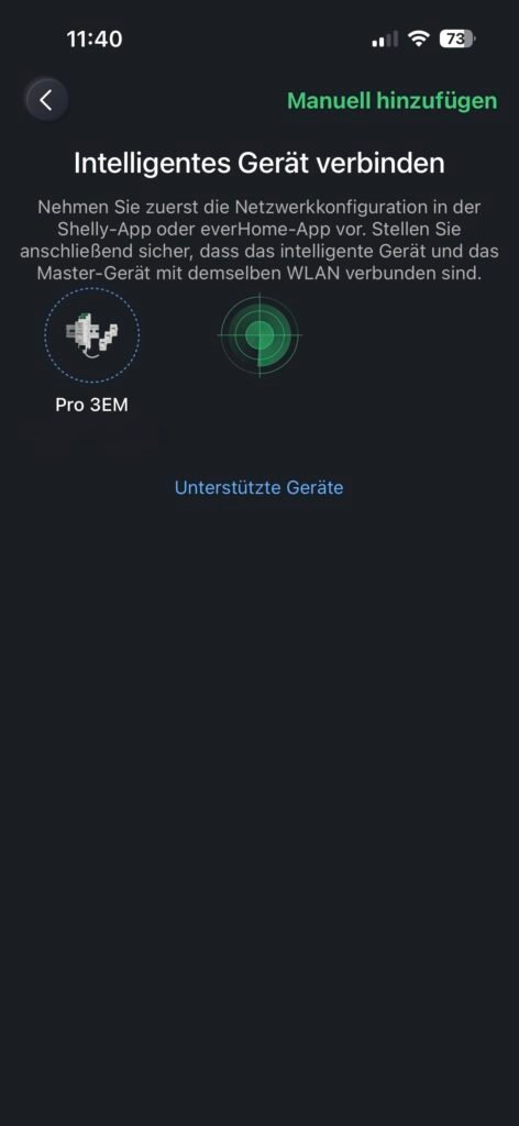 Auf der Startseite wählen Sie bitte oben rechts das Pluszeichen. Anschließend klicken Sie auf „Link Smart Devices“ und wählen das Gerät aus, das Sie hinzufügen möchten. Der Shelly Pro 3EM wurde automatisch erkannt und konnte direkt in der Hoymiles-App gekoppelt werden.