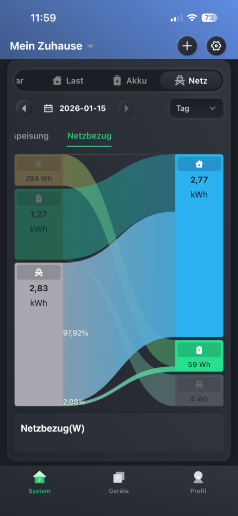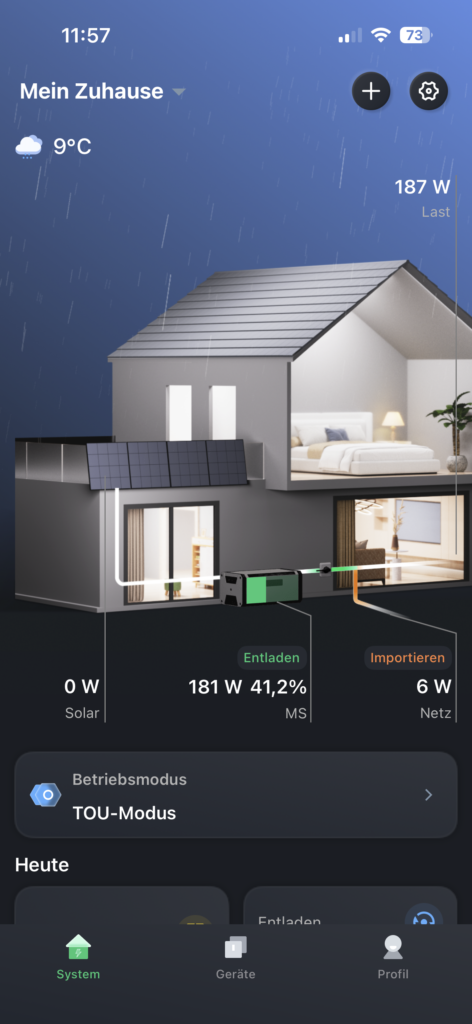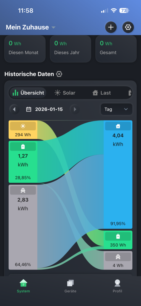 Der Hauptbildschirm der Hoymiles-App ist übersichtlich und ansprechend gestaltet. Am unteren Rand finden Sie praktische Grafiken, die den Energieverbrauch über verschiedene Zeiträume hinweg darstellen, darunter eine beeindruckende Sankey-Karte. Sogar die aktuelle Wetterlage wird in der Darstellung des Hauses berücksichtigt; so können Sie beispielsweise sehen, dass es gerade tatsächlich schneit.