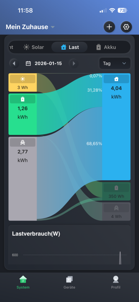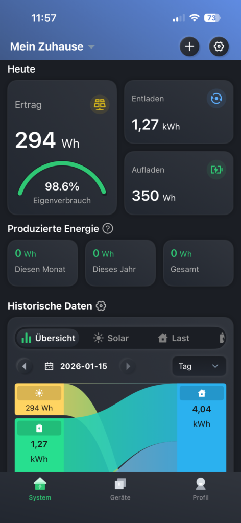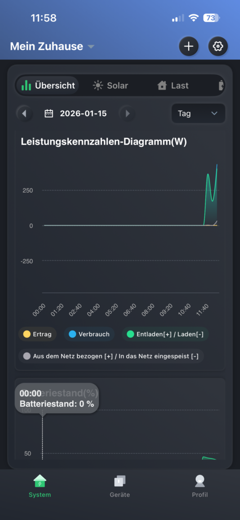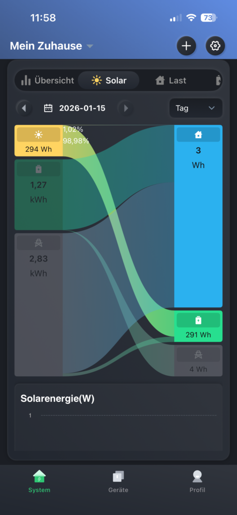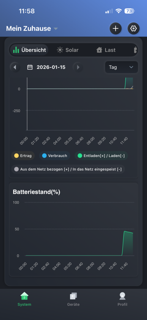 Auf dem Hauptbildschirm der App wird außerdem deutlich angezeigt, dass über die netzunabhängige Steckdose Solarstrom eingespeist wird, mit dem die Batterie aufgeladen wird. Obwohl auf den Fotos nur eine Leistung von etwa 50 W zu sehen ist, lässt sich dies vollständig durch die regnerischen Testbedingungen mitten im Winter erklären.