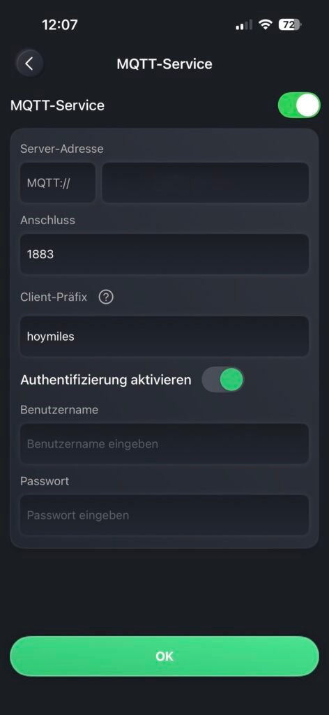 Um eine optimale Benutzererfahrung zu gewährleisten, könnte die App den MQTT-Modus als aktiven Status anzeigen, sobald dieser über MQTT aktiviert wurde, um Verwirrung zu vermeiden.