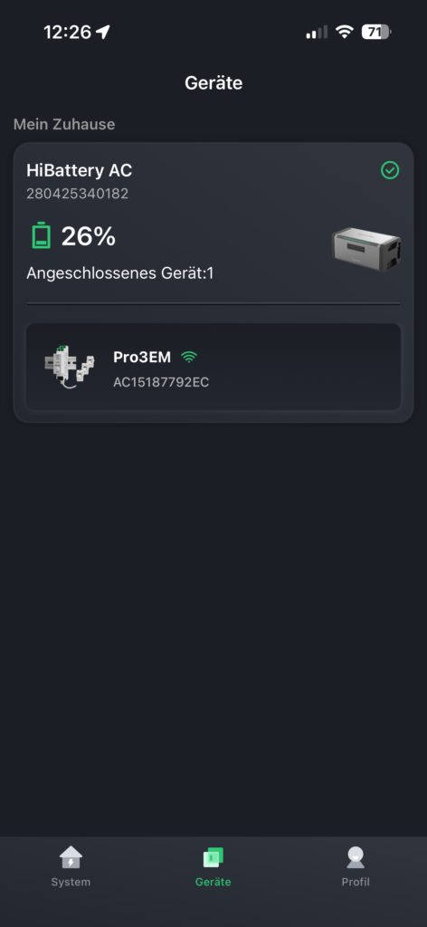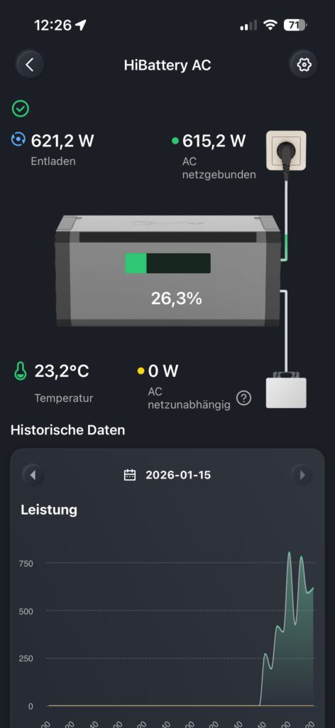 Die Konfiguration der HiBattery 1920 AC verlief reibungslos und war innerhalb von etwa zehn Minuten abgeschlossen. Die Verbindung der HiBattery 1920 AC mit der App funktionierte problemlos. Auch die Verbindung mit dem bei uns bereits verwendeten Shelly Pro 3EM verlief erfolgreich, das Gerät erkannte den Zähler sofort. Die Daten wurden ordnungsgemäß und vollständig eingelesen.