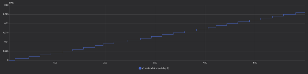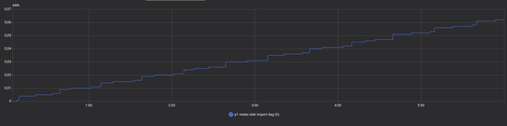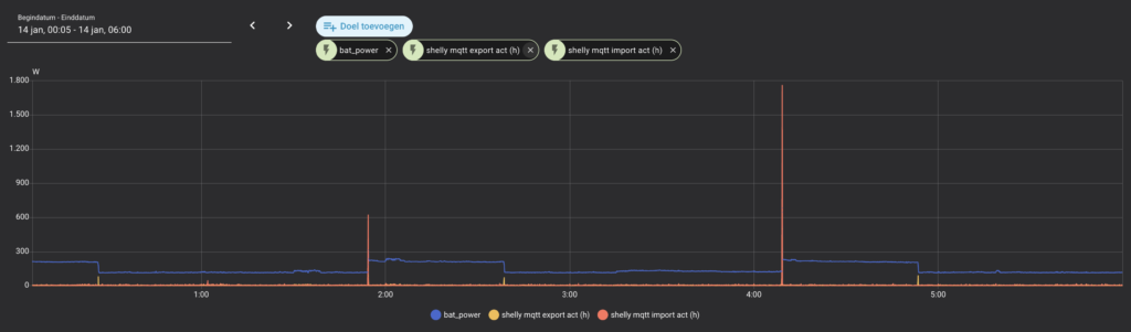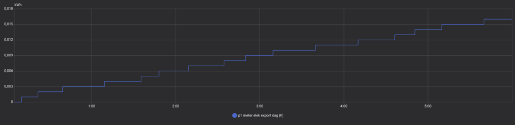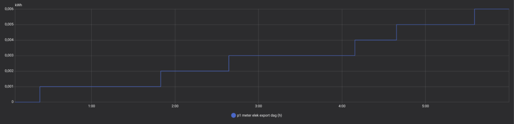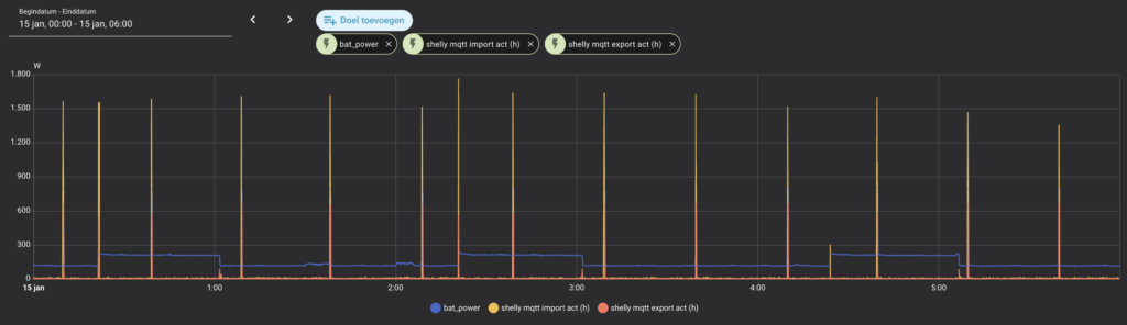 Ohne Quooker (in einer früheren Nacht) betrug der nächtliche Import nur 0,026 kWh und der Export 0,006 kWh. Wiederum ein sehr gutes Ergebnis. Dies zeigt, dass mit dem Shelly PRO 3EM eine präzise Nulleinspeisungs-Regelung möglich ist.