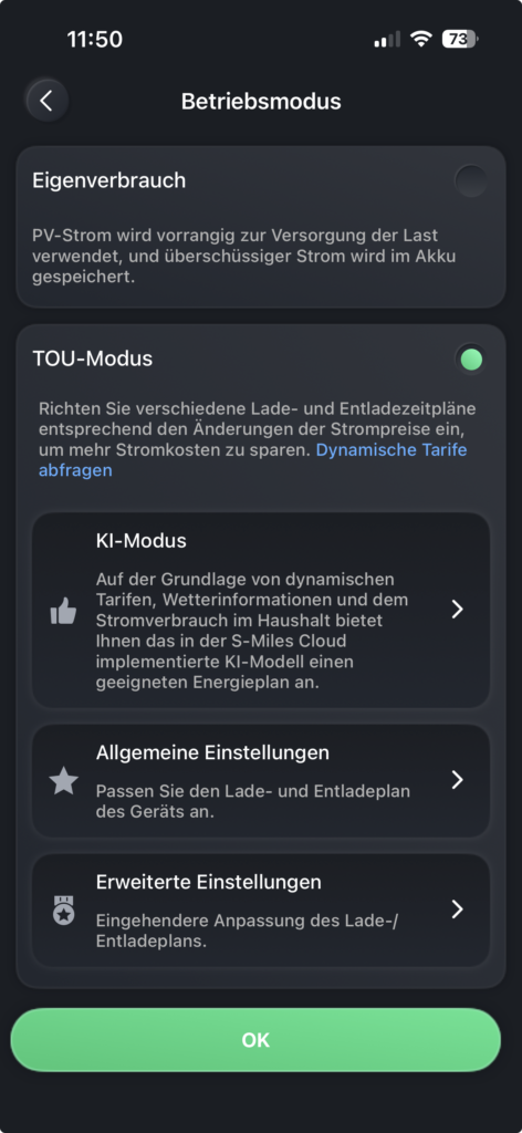 - Im Gegensatz zum Standardmodus „Eigenverbrauch“, bei dem die Batterie nur auf die Sonneneinstrahlung und Ihren aktuellen Verbrauch reagiert, zwingen Sie das System im TOU-Modus zu einem bestimmten Zeitplan. Im AI-Modus liegt der Schwerpunkt dabei auf den Preisen, wodurch die Logik des Eigenverbrauchsmodus außer Acht gelassen wird.