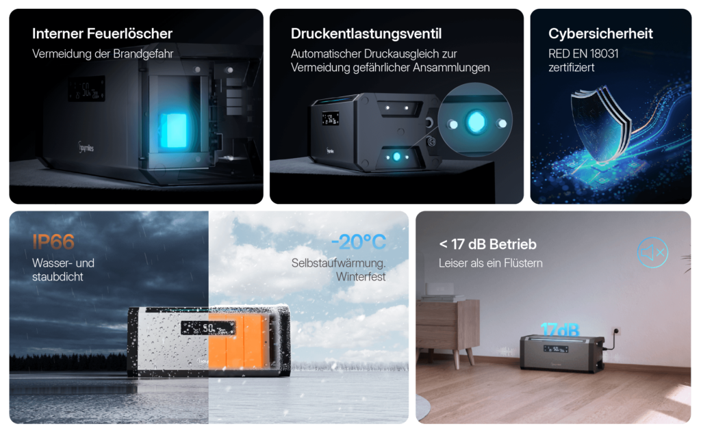 Hoymiles setzt auf die LFP‑Technologie (Lithium‑Eisenphosphat / LiFePO₄), ebenso wie viele andere Hersteller von Stromspeichern. Dieser Speichertyp ist für seine thermische Stabilität und chemische Sicherheit bekannt. Im Klartext: geringeres Risiko von Überhitzung, Brand oder Explosion. Ein beruhigender Gedanke – insbesondere, wenn Sie den Stromspeicher in Innenräumen verwenden.