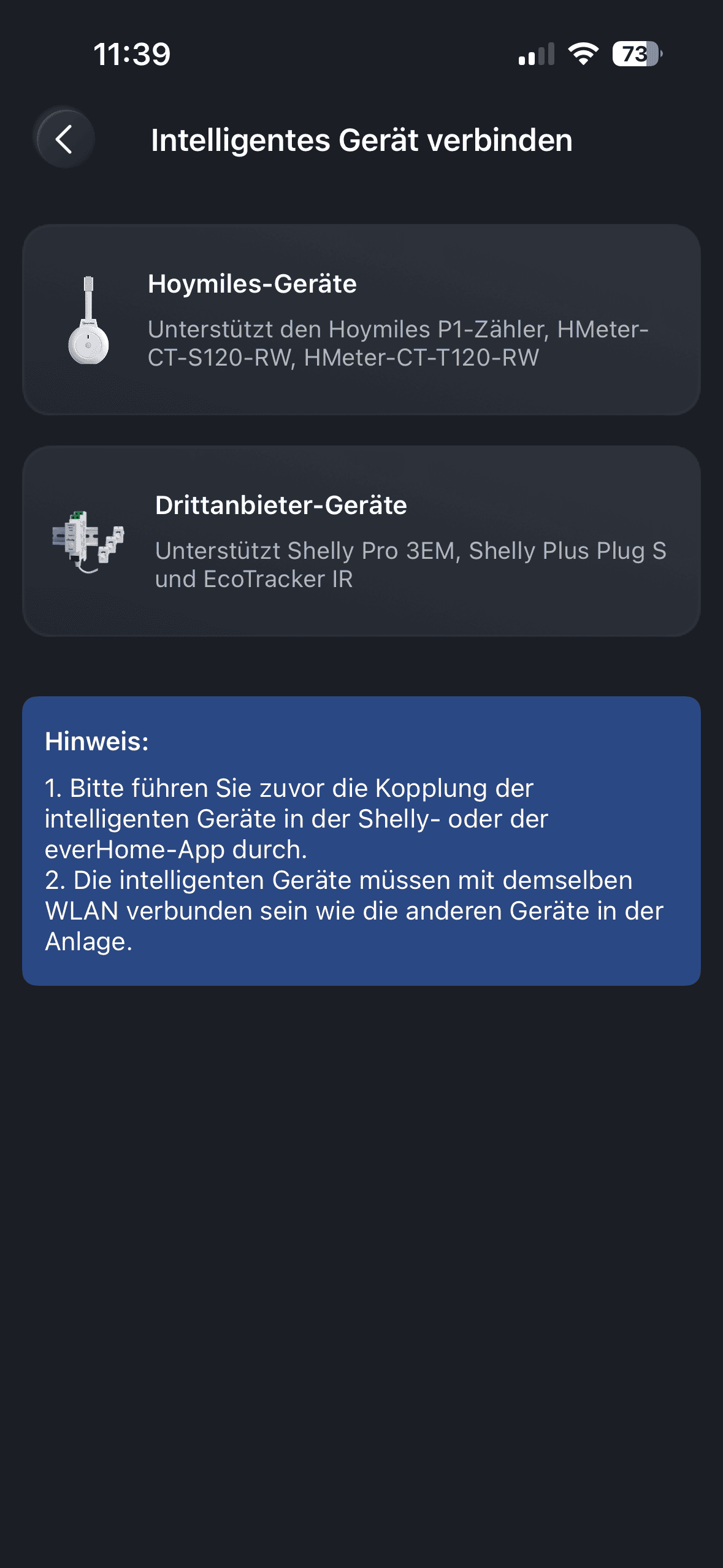 Auf der Startseite wählen Sie bitte oben rechts das Pluszeichen. Anschließend klicken Sie auf „Link Smart Devices“ und wählen das Gerät aus, das Sie hinzufügen möchten. Der Shelly Pro 3EM wurde automatisch erkannt und konnte direkt in der Hoymiles-App gekoppelt werden.