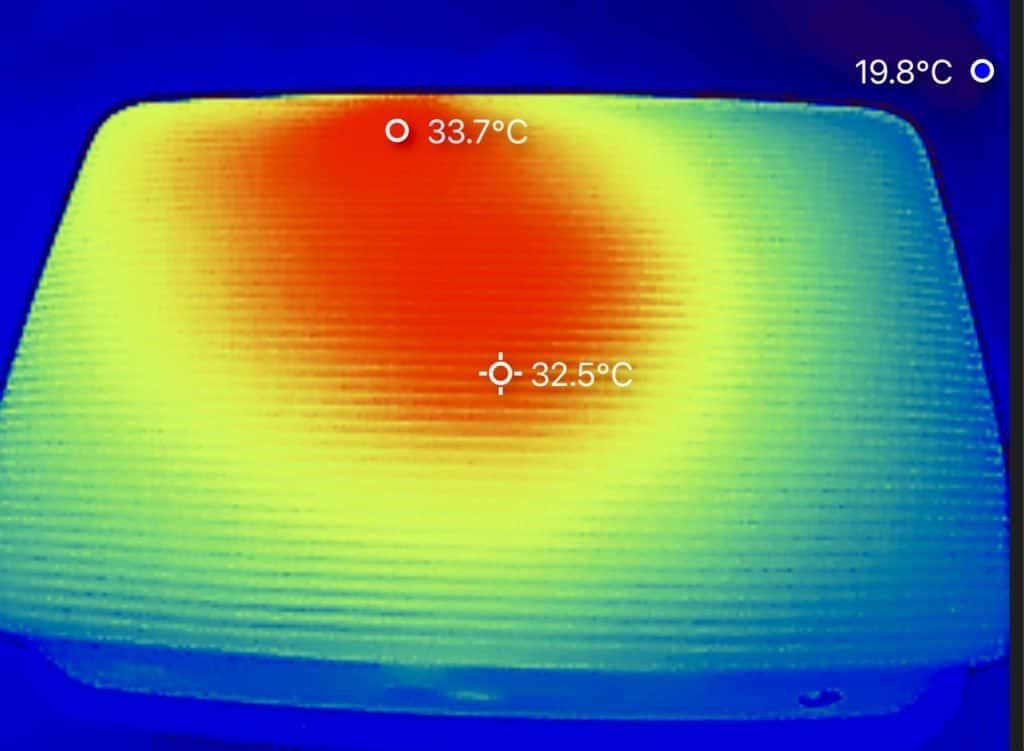 The first photo was taken after five minutes, the second after an hour. You can clearly see that the 2400 AC gets a bit warmer, but the temperature difference remains limited. In the second photo the temperature is still only 33 degrees.